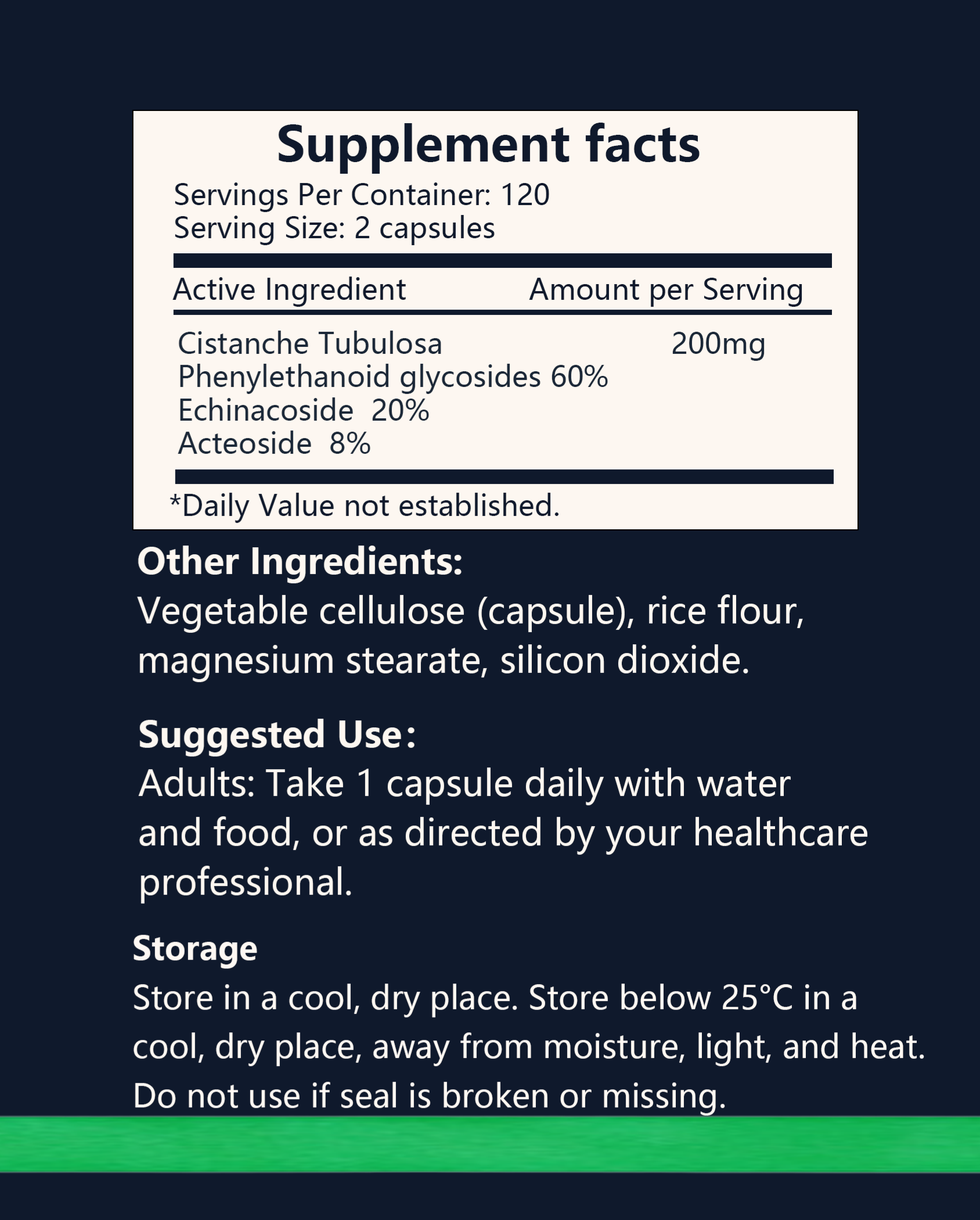 Each capsule contains 400 mg of Cistanche tubulosa extract, standardized for potency: