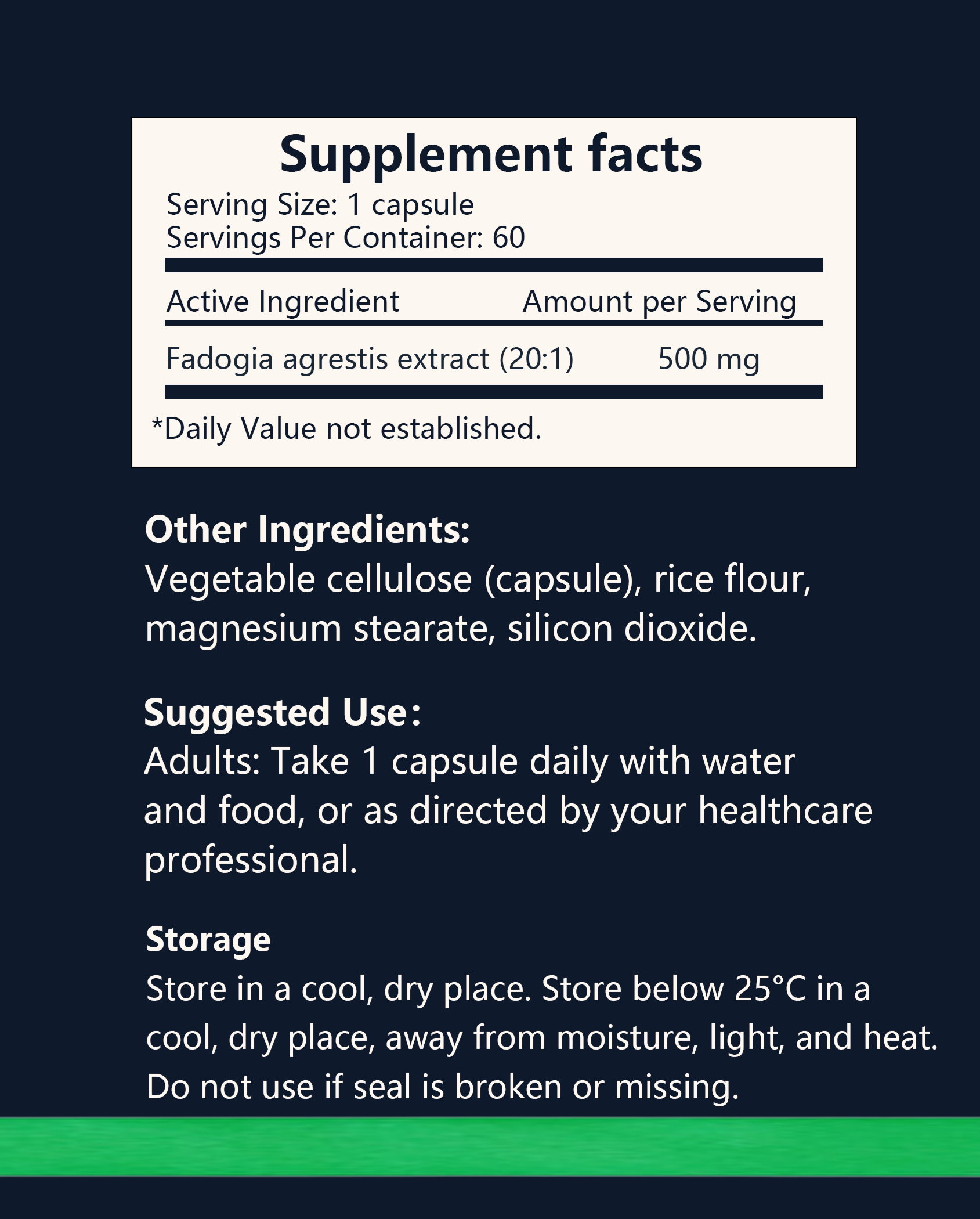 Fadogia may be taken once daily or divided into two servings (morning and early afternoon), depending on your performance protocol.